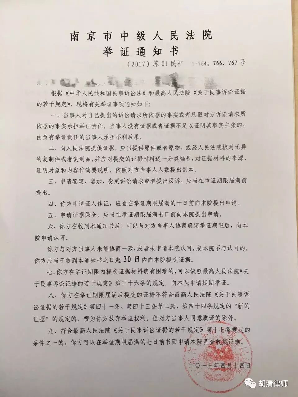 4月7日,胡清律师前往南京,对代理的投资者诉文峰股份证券虚假陈述案21个案件进行立案,南京市中级人民法院已全部立案受理。4月19日,我们收到南京中院寄来的举证通知书,我们将在规定期限内提交证据材料。
