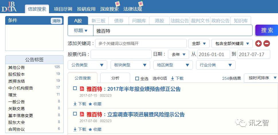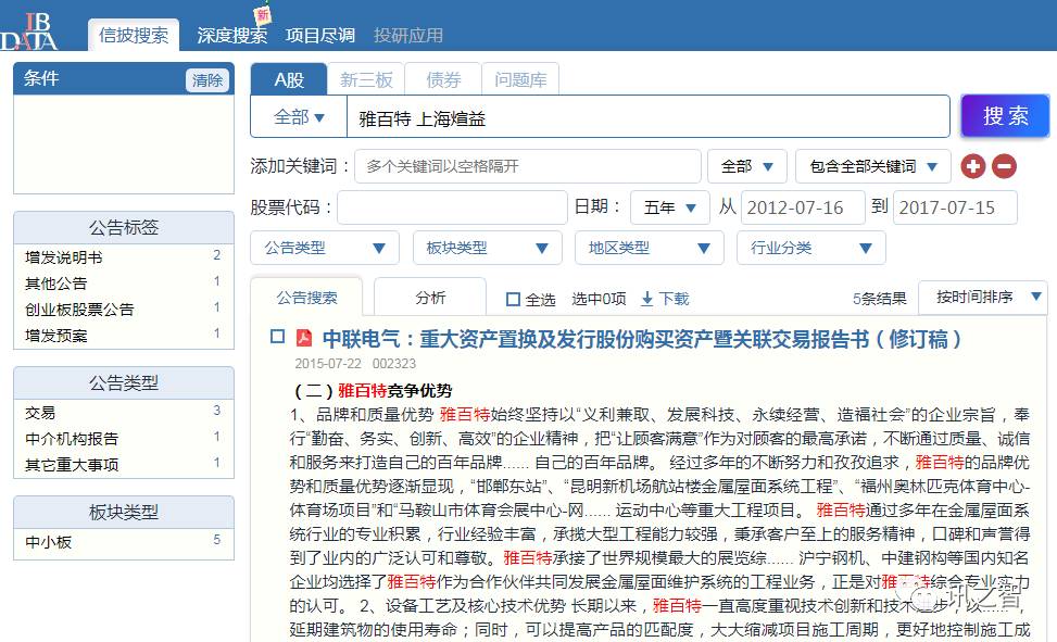 工具小贴士:了解最新公告,避免A股坑区。登录ibdata.cn,输入关键词搜索“雅百特”及其供应商“上海煊益”,穿透公告正文,精准定位所需公告!