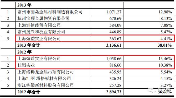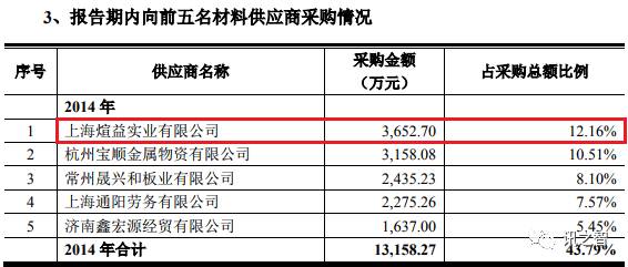 尽管雅百特2015年年报中对客户及供应商未提供具体公司名,但我们利用IBDATA还是搜索到了蛛丝马迹,通过借壳上市时披露的信息发现,上海煊益是雅百特的常客了,公司2014年单在上海煊益采购的金额就超过了2013年整年的采购金额。另外,2012年第二大供应商“佳铝实业”系同一实际控制人(陆永)控制的其他公司。