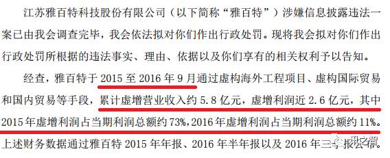 公告显示,自2015年至2016年9月,雅百特通过财务造假累计虚增营收约5.8亿元,虚增利润约2.6亿元,其中2015年虚增利润占当期利润总额约73%!