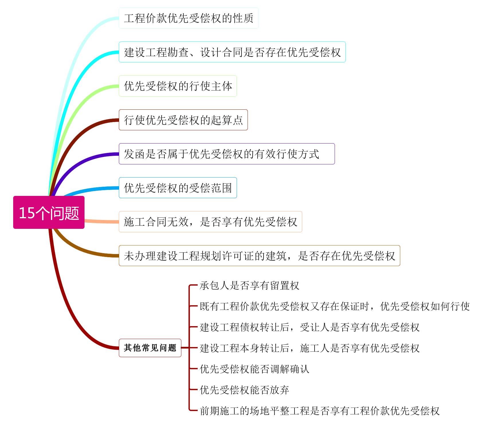 特别是关于建设工程价款优先受偿权的一些法律适用问题,仅在《合同法》第286条[1]和《最高人民法院关于建设工程价款优先受偿权问题的批复》(以下简称《批复》)中有所体现。由于建设工程价款优先受偿权优于抵押权,对各方当事人的权利影响较大,从本位利益出发,实践中各相关方纷争不止,各地法院意见也不尽相同。现就 15 个具体问题,试作总结和分析。