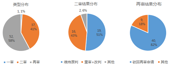 其中,二审案件的改判/发回重审率为43%,驳回再审申请率为86%,与往年统计的数据,即“二审改判比例50%左右,再审成功率均为10-15%左右”保持一致,体现了行业案件特点的稳定。